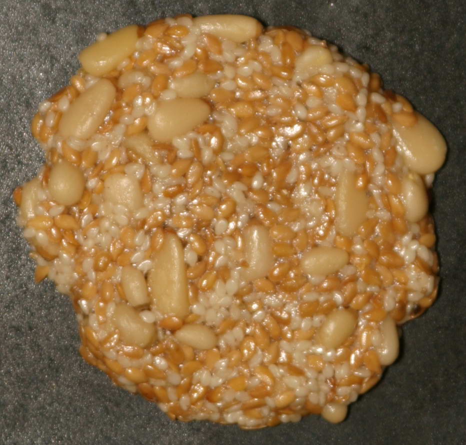 - The one I am making now is golden flax seeds, hulled white sesame seeds and pine nuts.